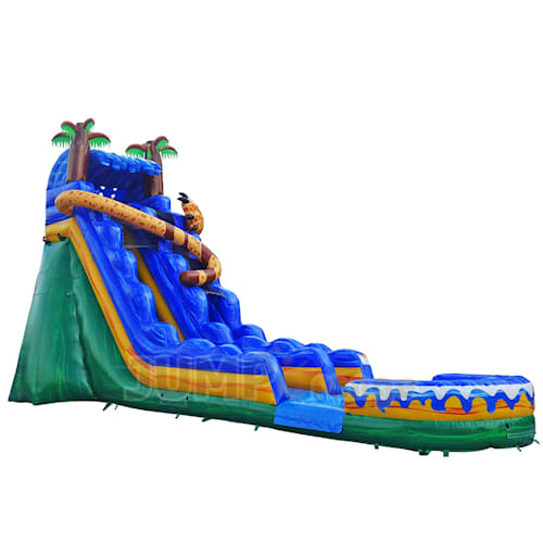 Our Jungle Splash Waterslide stands out with its stunning jaguar design, featuring vibrant blue and green hues that will captivate your guests. Measuring 20 feet high, 15 feet wide, and 36 feet long, it's not just a water slide; it's the centerpiece of fun at your gathering. Whether for a birthday party, family reunion, or corporate event, this water slide promises to be the highlight.